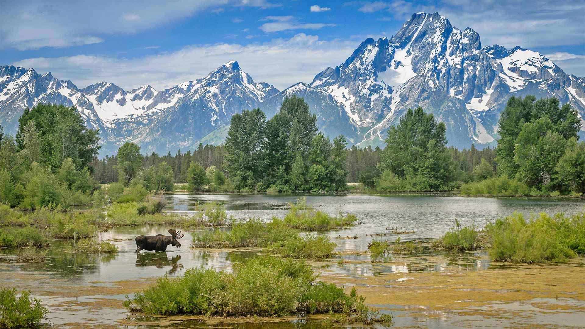 Moose crossing a pond below Mount Moran